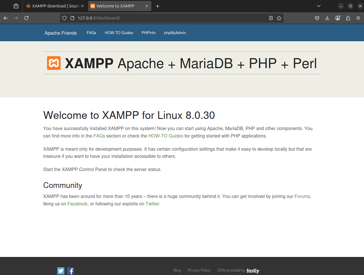 sudo ./xampp-linux-x64-8.0.30.0-installer.run- Na installatie kun je de server starten met: