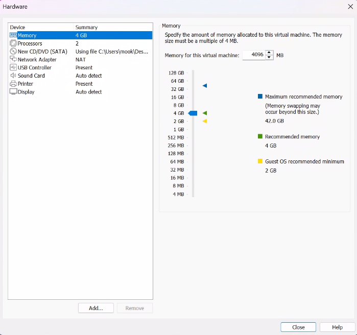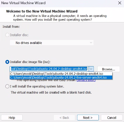 - Maak een nieuwe VM aan in VMware, kies de Ubuntu ISO als installatiebron.