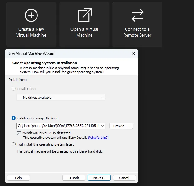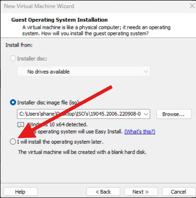De Windows 10 Enterprise ISO geeft vaak problemen met de 'Easy Install' functie van VMWare Workstation Pro Player. Daarom moeten we de installatie net iets anders aanpakken. Klik op 'I will install the operating system later'.