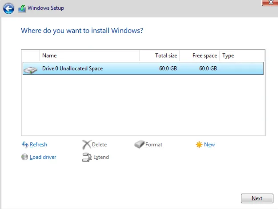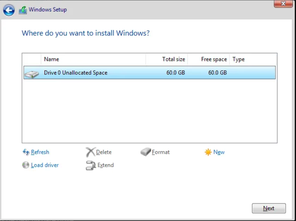 Wellicht zie je maar één optie als Drive, die we zojuist hebben toegewezen. Klik op 'next' en de installatie van de server begint.