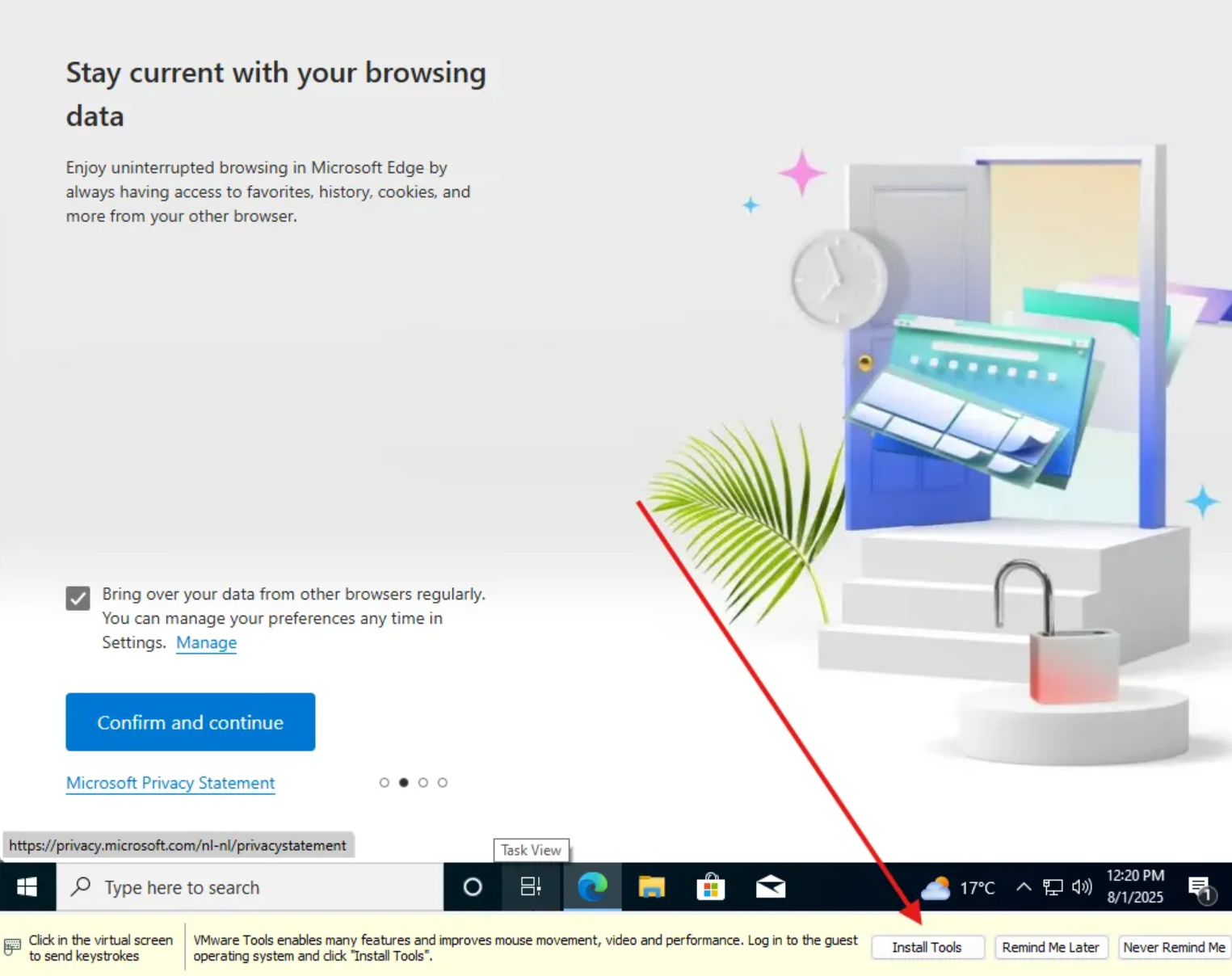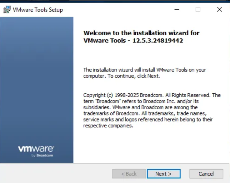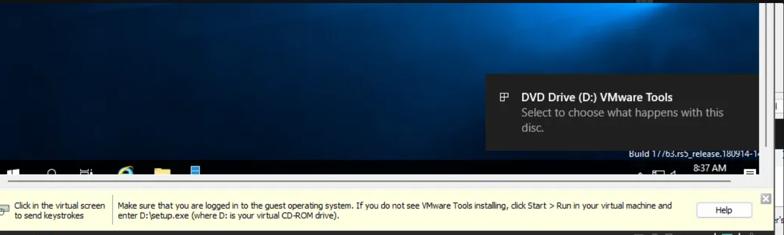 Als je dit ziet is het gelukt. Nog één stap: VMWare Tools installeren. Dit zorgt ervoor dat je scherm van je VM kan resizen, etc.