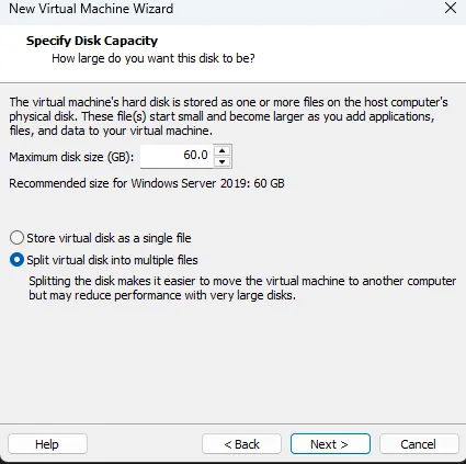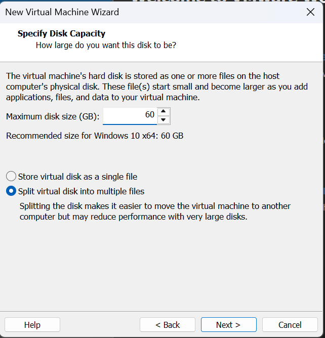 De VM zal wederom geen 60gb worden, maar het word wel aangeraden dit toe te wijzen.