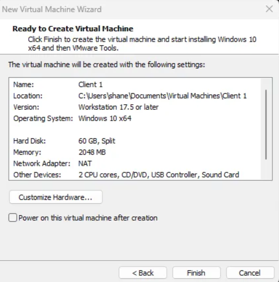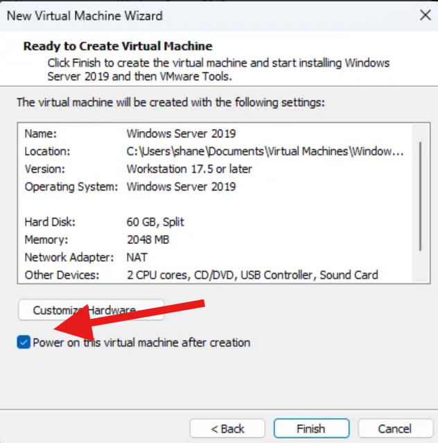 Zorg dat de 'Power on this virtual machine after creation' uit staat.