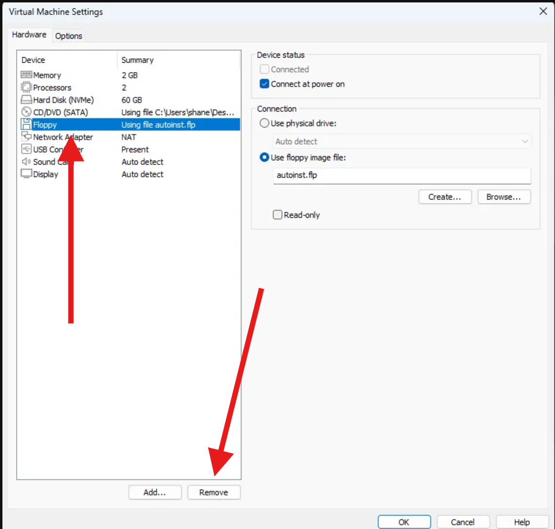 Verwijder deze Floppy optie. Anders kan de VM vreemd gaan doen tijdens de installatie.