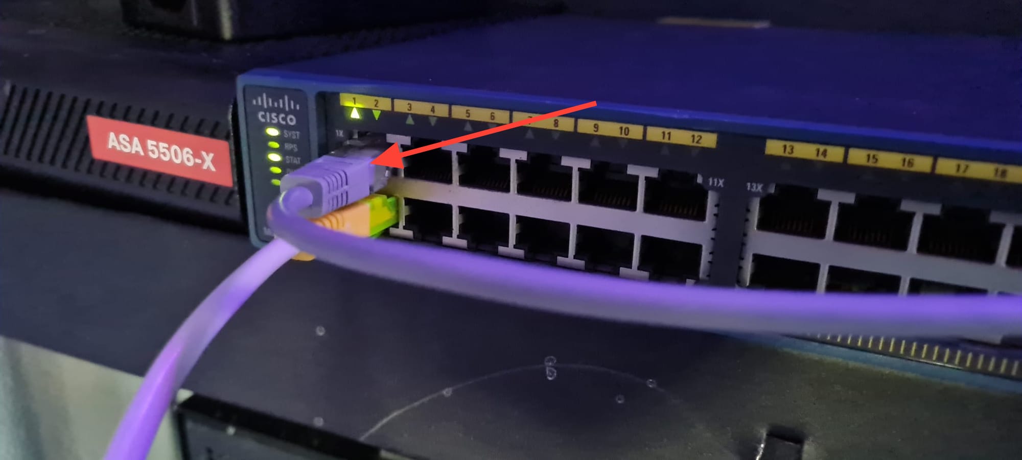 Nadat ik de stroomkabel had ingeplugd, heb ik de switch even laten opstarten totdat het opstartgeluid afnam. Op dat moment waren er nog geen andere netwerkkabels aangesloten.
