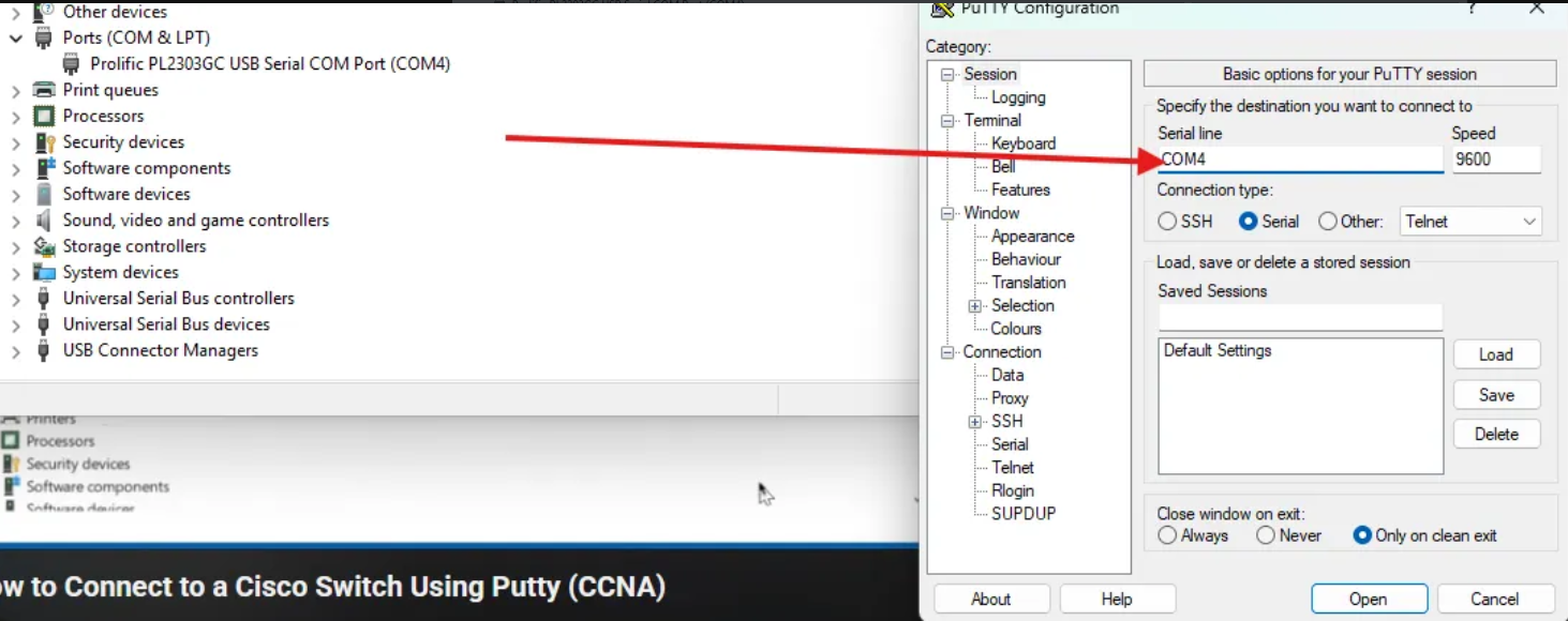 Nadat PuTTY was geïnstalleerd, heb ik de consolekabel aangesloten op een USB-A-poort van mijn laptop en op de consolepoort van de switch. In Device Manager heb ik gecontroleerd welke COM-poort werd toegewezen, in dit geval COM4.