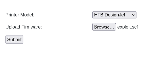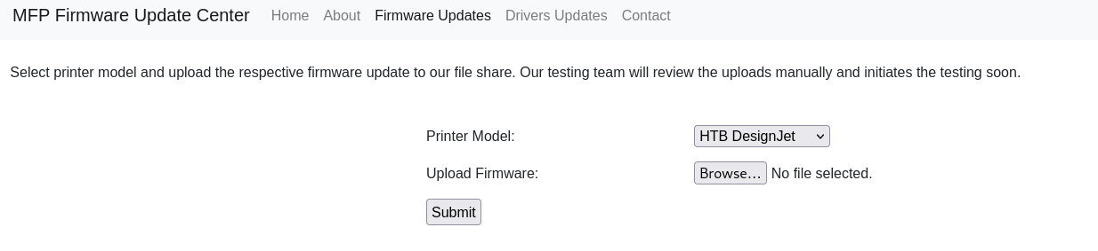 Select printer model and upload the respective firmware update to our file share. Our testing team will review the uploads manually and initiates the testing soon. De "firmware" die we hier kunnen uploaden gaan naar een 'file share' Een PHP-webshell heeft hier weinig zin, aangezien de upload niet op een webserver terechtkomt.