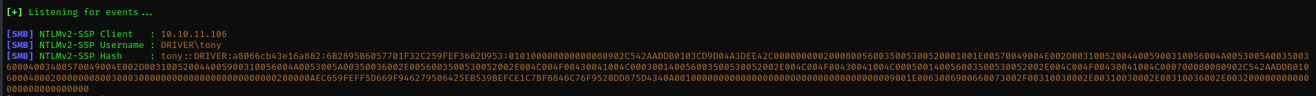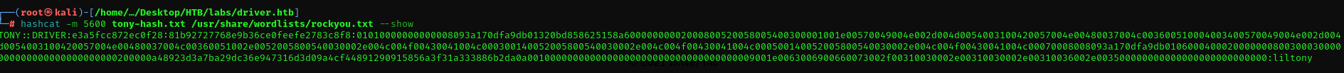 echo 'tony::DRIVER:a8066cb43e16a882:6B2895B6057701F32C259FEF3682D953:010100000000000080902C542AADDB0103CD9D04A3DEE42C0000000002000800560035005300520001001E00570049004E002D003100520044005900310056004A0053005A003500360004003400570049004E002D003100520044005900310056004A0053005A00350036002E0056003500530052002E004C004F00430041004C000300140056003500530052002E004C004F00430041004C000500140056003500530052002E004C004F00430041004C000700080080902C542AADDB0106000400020000000800300030000000000000000000000000200000AEC659FEFF5D669F946279506425EB539BEFCE1C7BF8846C76F9520DD875D4340A0010000000000000000000000000000000000009001E0063006900660073002F00310030002E00310030002E00310036002E003200000000000000000000000000' > tony-hash.txtMet hashcat kraken we de hash: