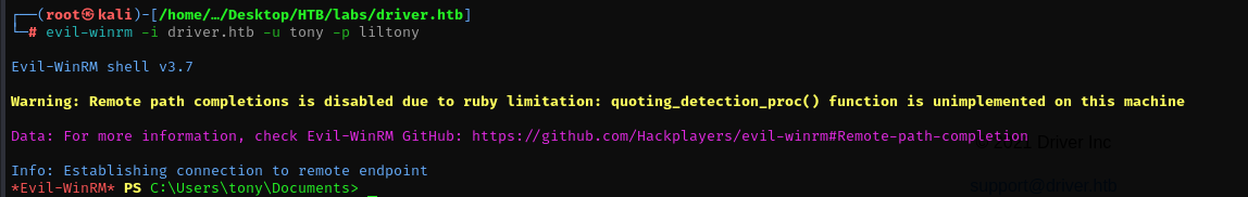 Met het verkregen wachtwoord leggen we via Evil-WinRM een verbinding met de machine.