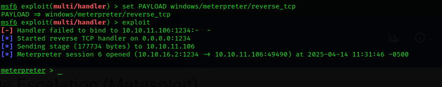 We draaien de payload en krijgen een Meterpreter-sessie binnen.