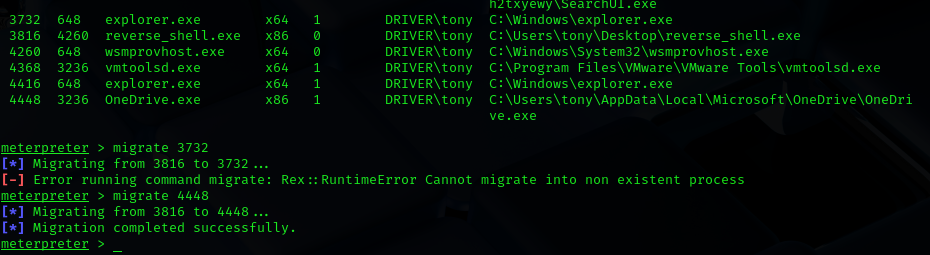 Gevonden. Maar voordat we de module succesvol kunnen uitvoeren, moeten we de payload eerst migreren naar een andere service — dit is nodig om privilege escalation mogelijk te maken.