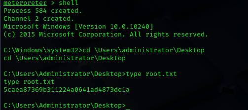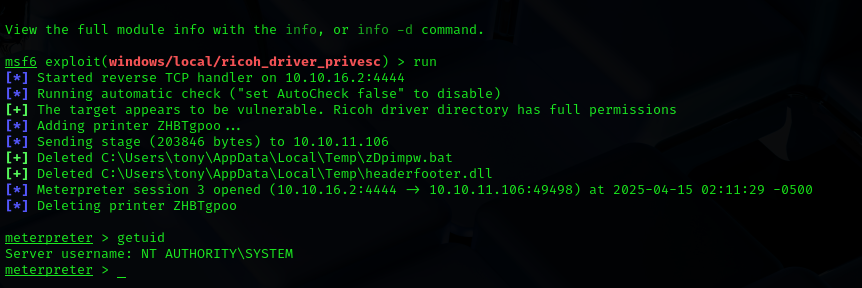 Met het commando getuid bevestigen we dat we nu beschikken over NT AUTHORITY\SYSTEM-rechten.